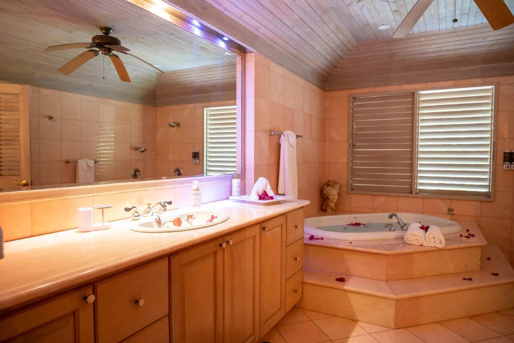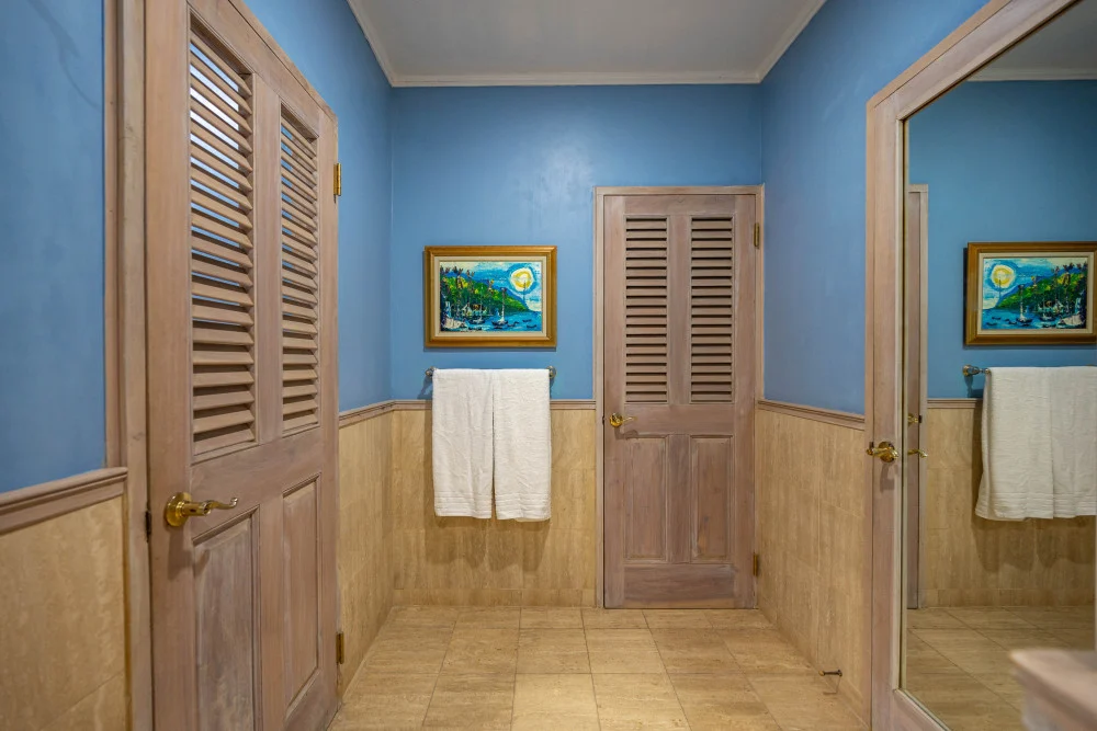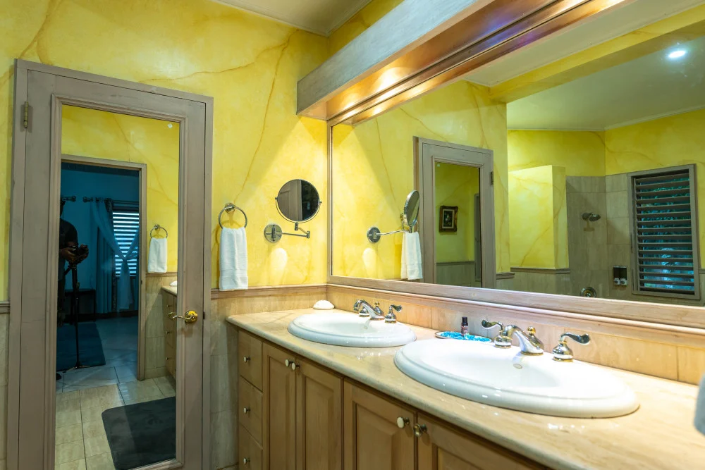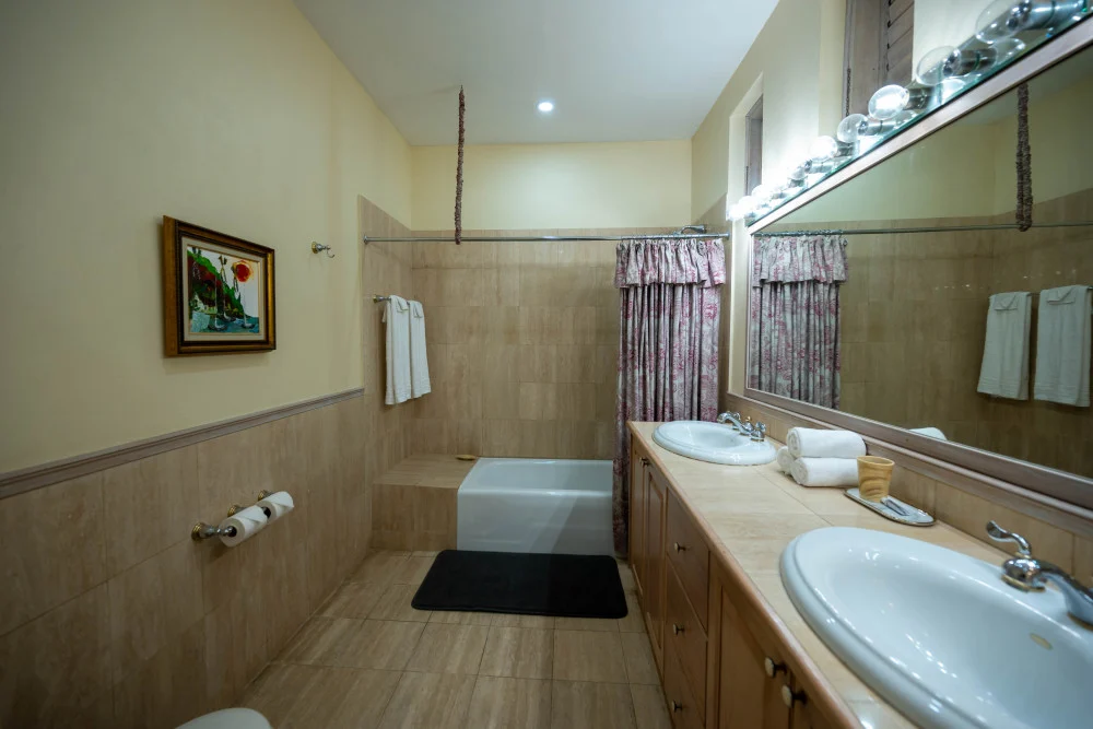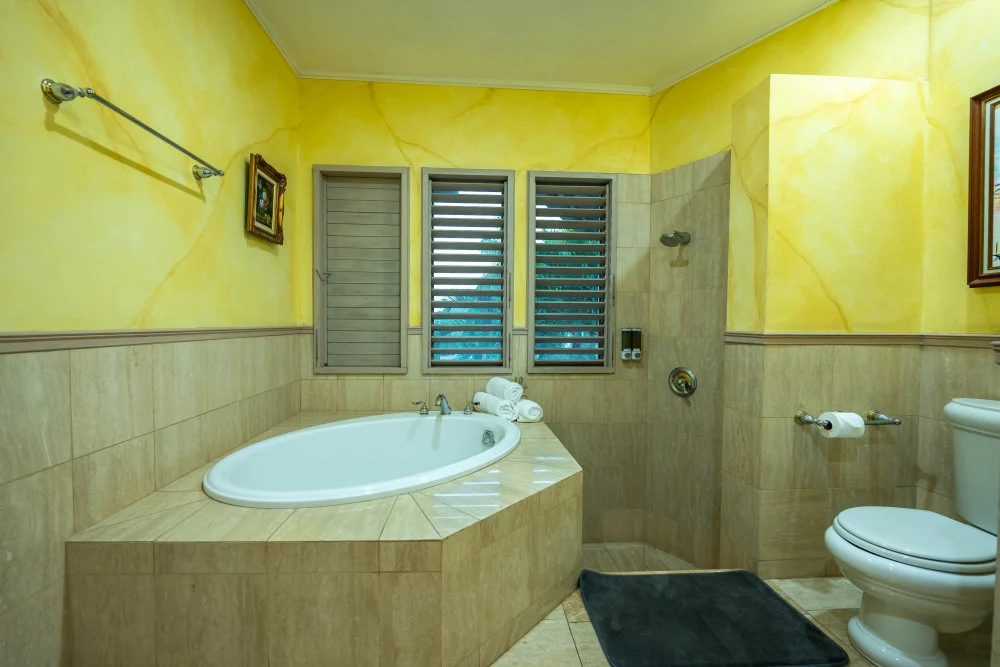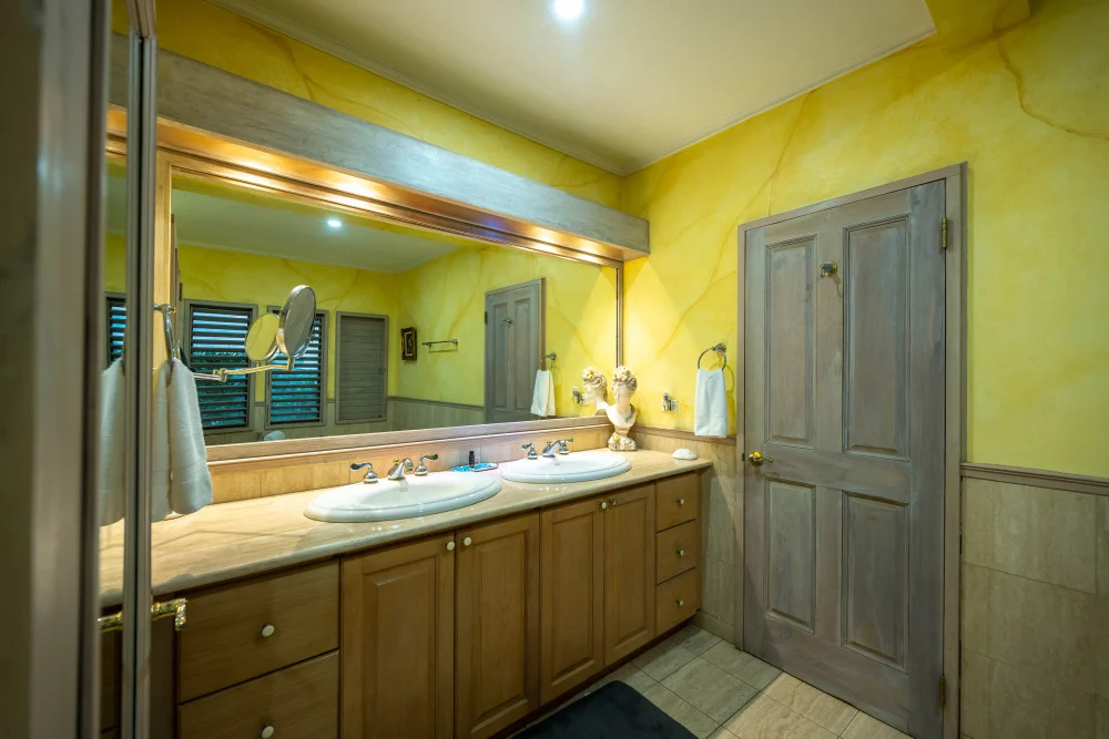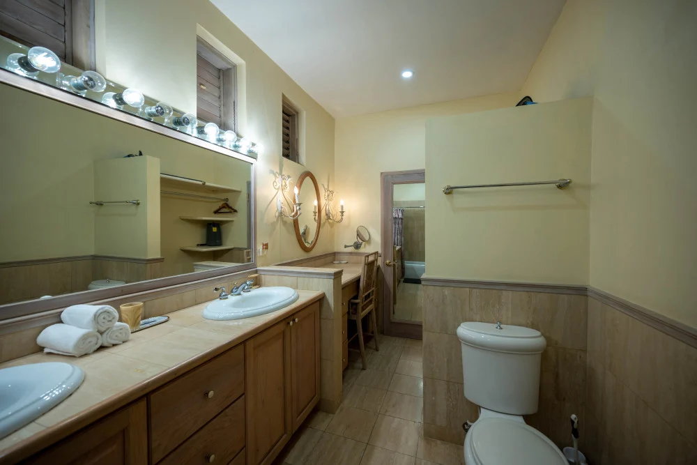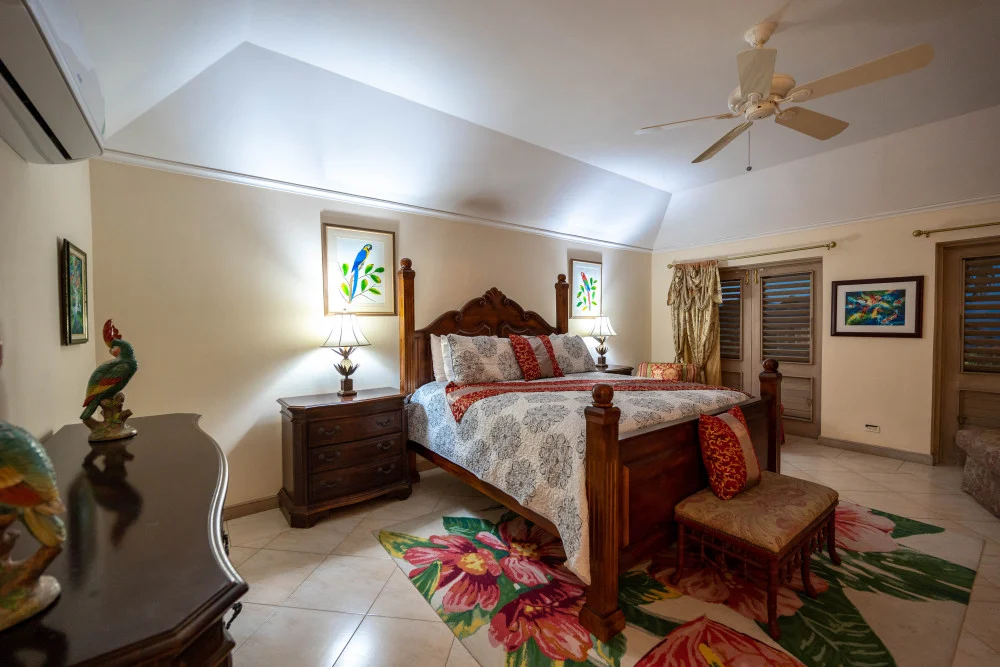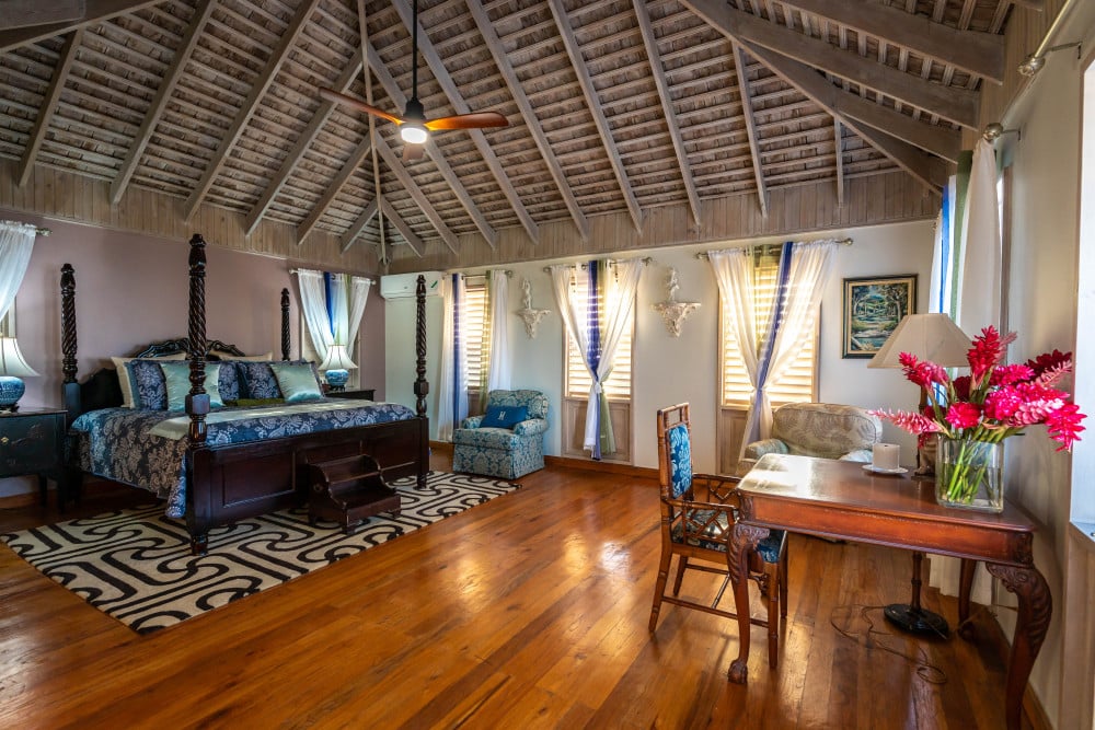 Inside, the immaculate and unique themed guest bedrooms are fully optimized for families and groups seeking the best 7 bedroom villas in Jamaica. The accommodation comprises a 7-bedroom, 7.5-bathroom configuration ideally suited for up to 16 guests. Accompanied by airy living spaces, a fully-equipped kitchen with breakfast bar, service kitchen and private bar, this Jamaica villa with private pool provides a classic oasis in which to unwind and entertain.